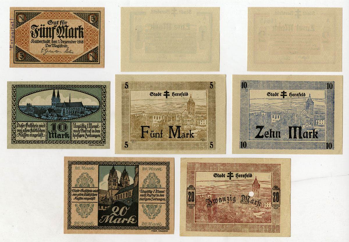 Germany, 1918. Lot of 8 Issued and Cancelled Notgeld, Includes: Stadt Halberstadt 5 Mark, 10 Mark, and 20 Mark Notes with "Entwertet" stamped at margins, 1918; Stadt Hersfeld 1 Mark, 2 Mark, 5 Mark, 10 Mark, and 20 Mark - 5 & 10 Mark have "Ungultig" stamps and 20 Mark has POC, 1918. Notes range from VF to AU condition. (8). Sold "AS IS" no returns accepted.