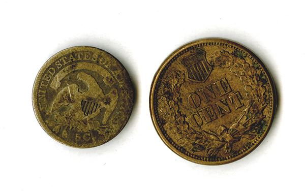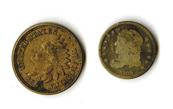 Half Dime, 1835. Good-Very Good, light scratches on reverse; Indian Head Cent, 1863. Nice Very Fine, pleasing. 2 pieces.