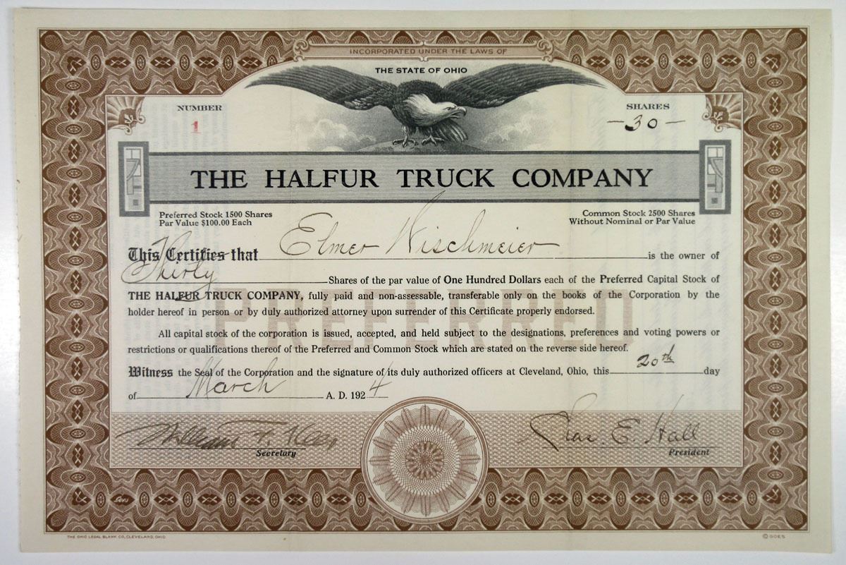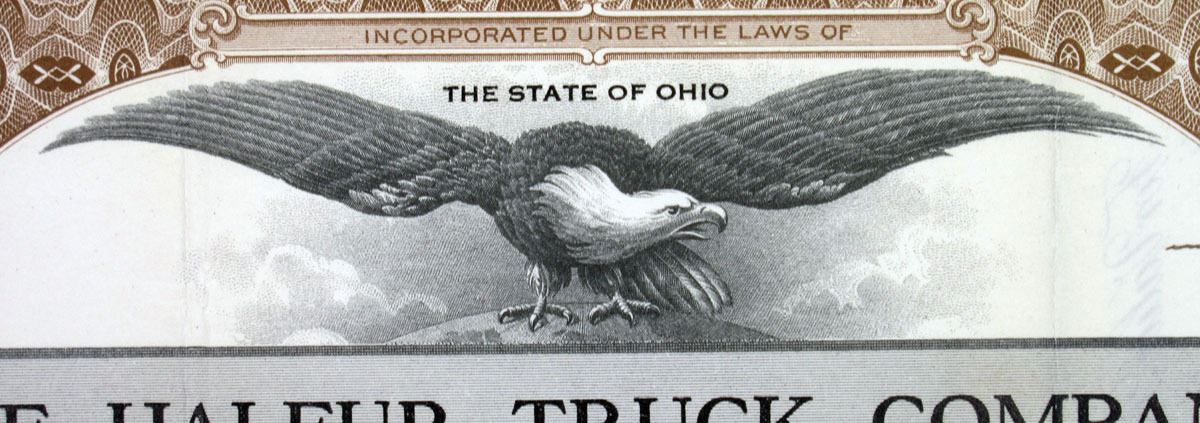 Ohio…., 1924. 30 Shares I/U Preferred Capital Stock Certificate, S/N 1, Black text with brown border and underprint, Eagle at top center. VF condition, Ohio Legal Bank Co.