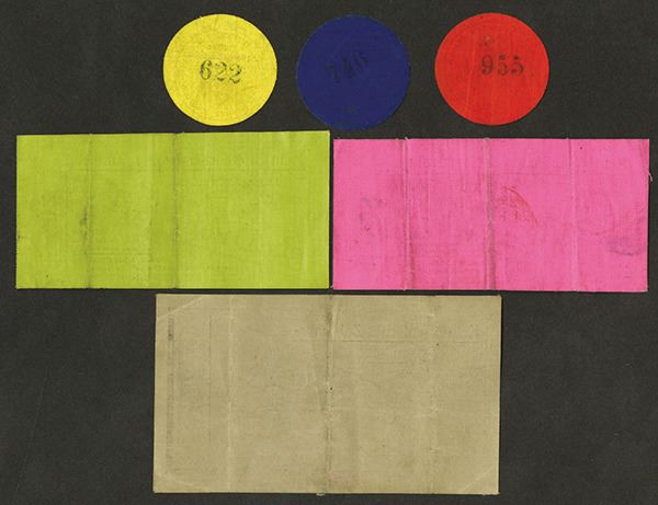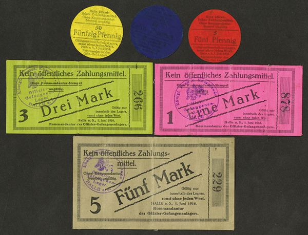Germany, WWI P.O.W. Camp. 5, 10, 50 pfennig, 1, 3, 5 Mark. Round or rectangle. Printed on linen. Low serial #s. The Mark denominations have a validation hand stamp on face. Very Fine. 6 pieces.