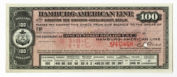 Germany and the U.S., ND ca.1900, $100 P-Unlisted, specimen Traveler's Check, Arms at left, exchange rates of different currencies at bottom, black on light red, Information on back for cashing, Specimen overprints, POC's, ABNC.