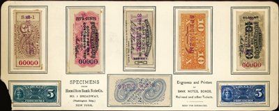 188-. 8 different specimen or proof train and trolley tickets mounted on horizontal advertising card for Hamilton BNC. Companies include Suburban Rapid Transit; Brooklyn Elevated RR; NY & Brooklyn Bridge RR; Union RR Co., Providence, RI (2) and 2 that list no location. printed on advertising card is "Specimens from Hamilton BNC, No.1 Broadway, NY, engravers and Printers of Bank Notes, Bonds, Railroad Tickets, Send for estimates". Rare HBNC advertising card. Small piece missing from lower left corner that also nicked a small piece out of one of the Union RR tickets, otherwise it would grade choice condition. HBNC.