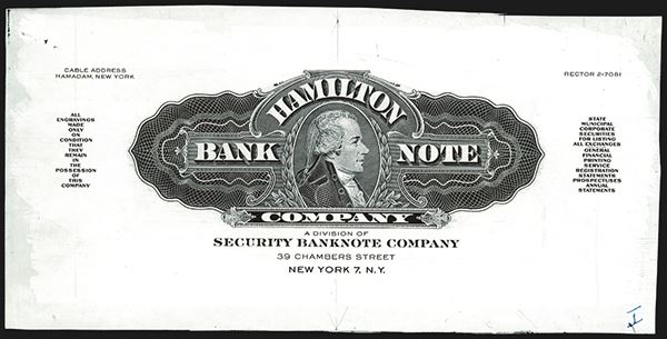 NY. Hamilton Bank Note Co. Letterhead top. Proof. Uniface. Ink notations and staple hole in top corner. As made.