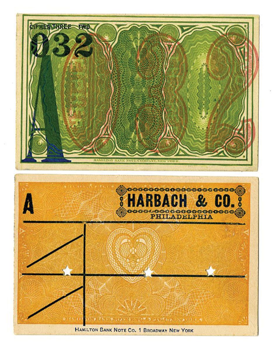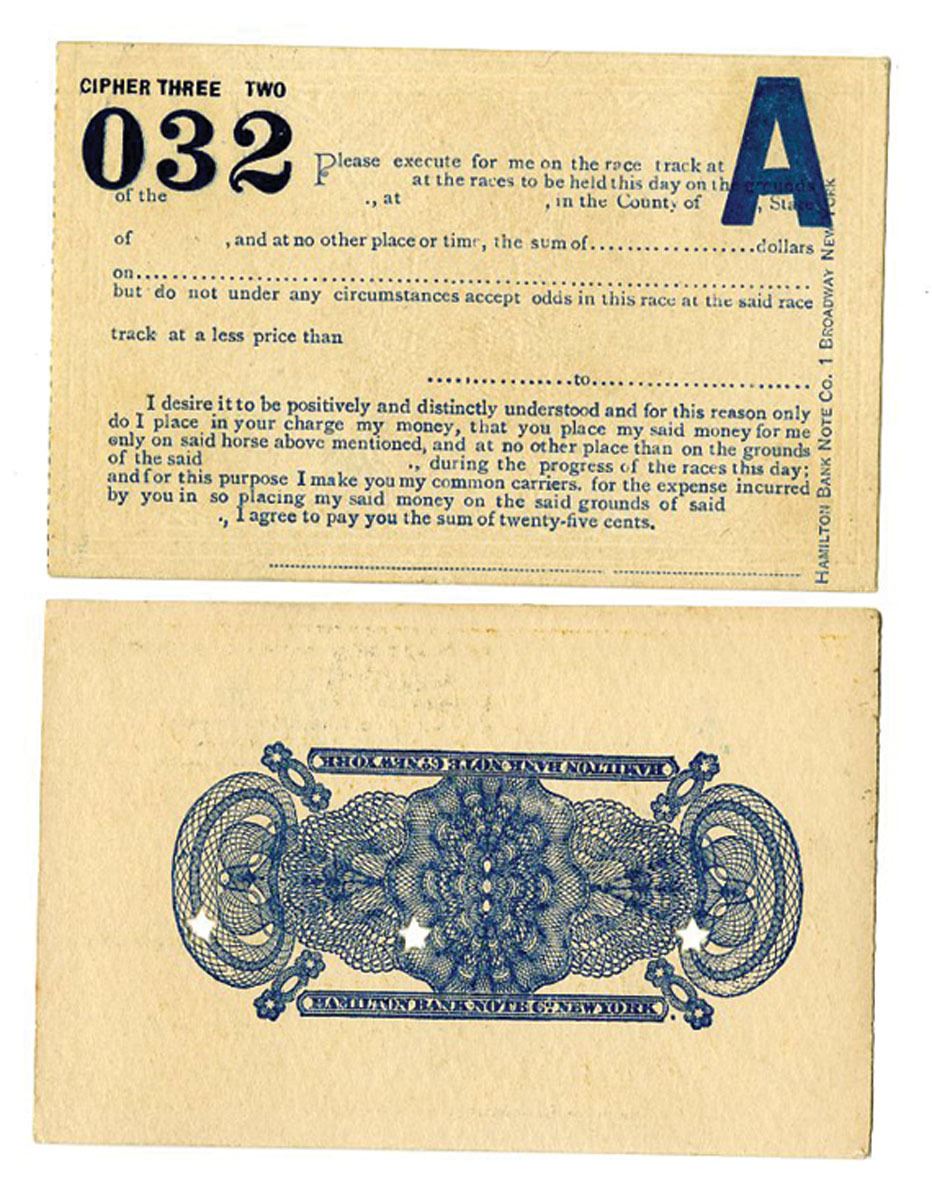 Hamilton Banknote Co. Advertising Note and Harbach & Co. Racetrack Betting Tickets, Uncirculated condition (2).