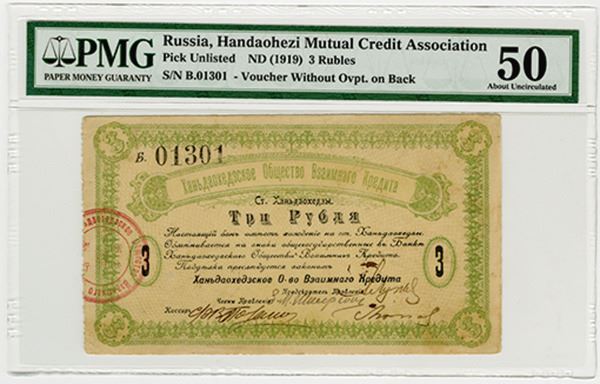 Harbin, China - Russia. Issued 3 Rubles, ND (1919), P-Unlisted. PMG graded About Unc 50 with comment "Stains" (Cert # 5003603-012).