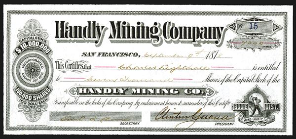 San Francisco office, Bodie District, Mono County, California. 7,000 shares at $100 per, miner with pick at lower right, IU, EF. Located between the Goodshaw and the Bodie. Similar items have brought up to $1,500 at auction.