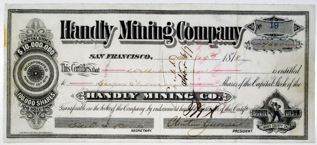 Bodie, California, 1878. 7,000 Shares I/C Capital Stock Certificate, S/N 19, Black text with black border, Bodie Dist. seal depicted at bottom right corner. VF condition.