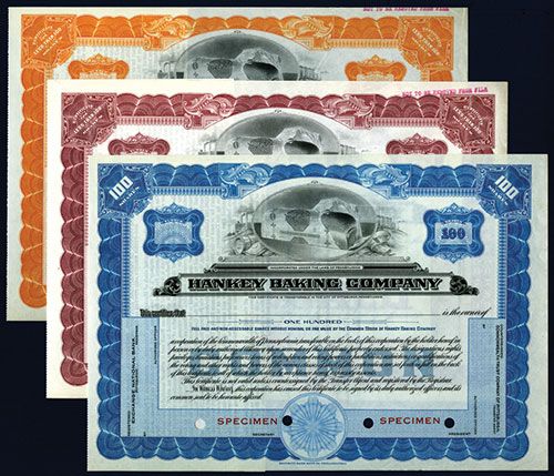3 different specimen stock certificates. 2 are common and 1 is a preferred stock, all in different colors and share amounts. All have vignette of a “ My-t-Fine” loaf of bread. All are in XF condition. Red specimen overprints and POC's. Tasty lot of stocks.