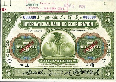 1918, 1919. P-S407; S411. $1; $5 Specimen. P-S407, $5, 1918, 1921 date stamped on top margin. Choice Unc. P-S411, $1, 1919, XF-AU with 2 vertical folds in middle. Both have red specimen overprints, POCs and are unlisted as a specimens in pick. Scarce pair. ABNC.