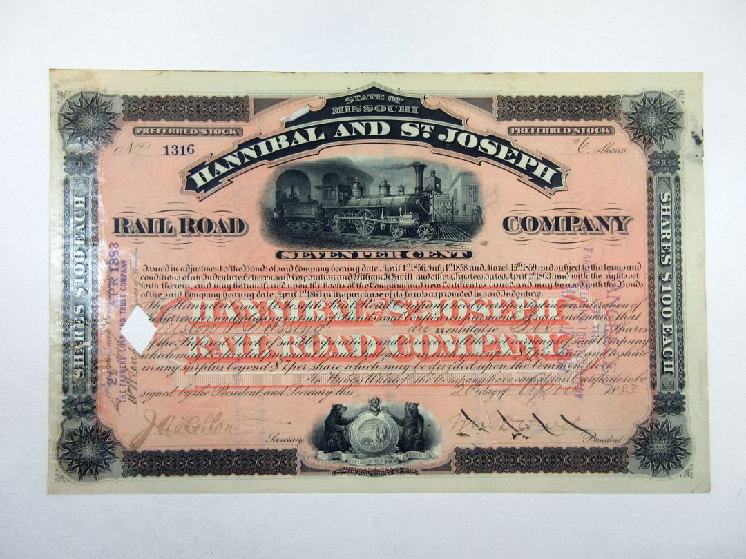 MO. Hannibal & St. Joseph Railroad Co., 1915 1 Shr I/C Stock Cert., VF NBN. The Hannibal and St. Joseph Railroad was the first railroad to cross Missouri starting in Hannibal in the northeast and going to St. Joseph, Missouri, in the northwest. It is said to have carried the first letter to the Pony Express on April 3, 1860, from a train pulled behind the locomotive Missouri.