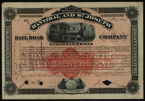 Missouri, 1877, 1 Share, Issued Stock, black on black border and orange underprint, Locomotive leaving station top center with Missouri State Arms bottom center, VF-XF condition, National BNC.