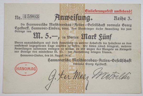 Germany. 1914. Lot includes an issued 5 Mark Notgeld from Hannover. Hanomag was a German producer of steam locomotives, tractors, trucks and military vehicles in Hanover. Hanomag first achieved international fame by delivering numerous steam locomotives to Finland, Romania and Bulgaria before World War I and making of first tractor Hanomag R26 in 1924 in Germany. About to Choice Unc.