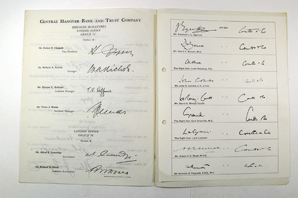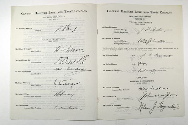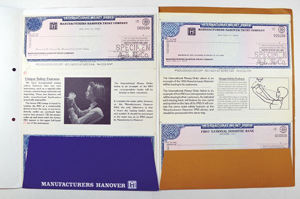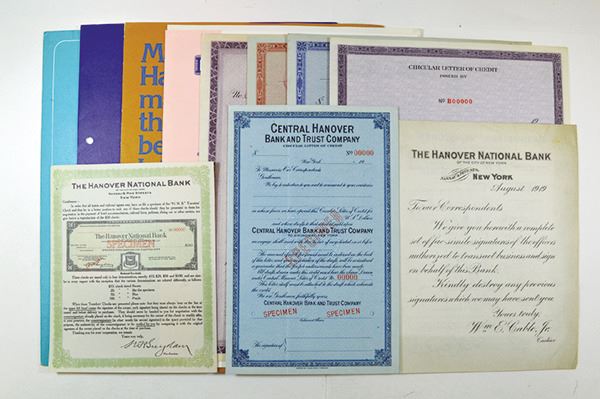 New York. Hanover National Bank Circular Letter of Credit 4 page ABNC Specimen plus 1919 facsimile signature document and Travelers' Check flier; Central Hanover Bank & Trust Co. Letter of Credit and ID form; same in Blue and Brown (ABNC Specimens) With 1947 signature flier; Manufacturers Hanover pre (1) and post 1980 (2) International Money Order specimens and 2 of the 3 brochures (6 check specimens); IMO 1971 Specimen computer card check and brochure. A nice New York bank lot.