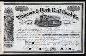 Pennsylvania, 1879, 25 shares. Issued and punch cancelled stock certificate. Black border locomotive leaving station and ornate counterfoil with track workers and train. A. Hoen & Co. Litho, Balt., VF. Stub attached. Scarce stock and very attractive.