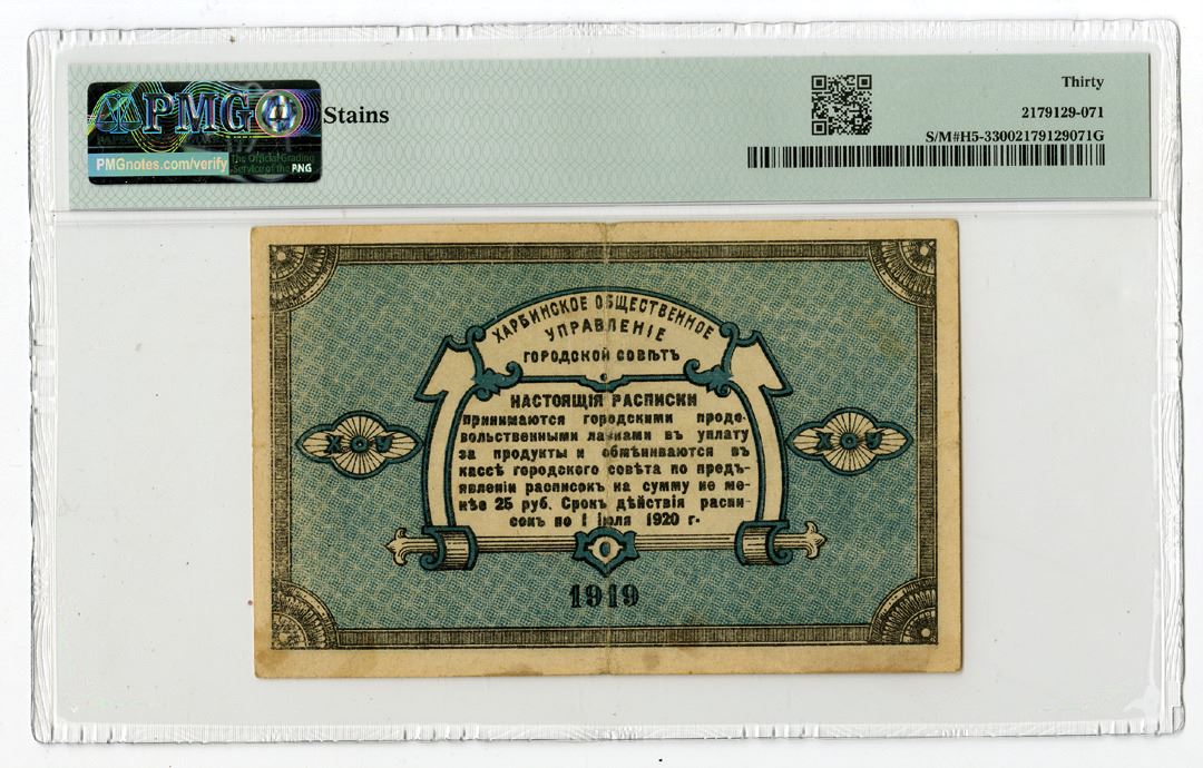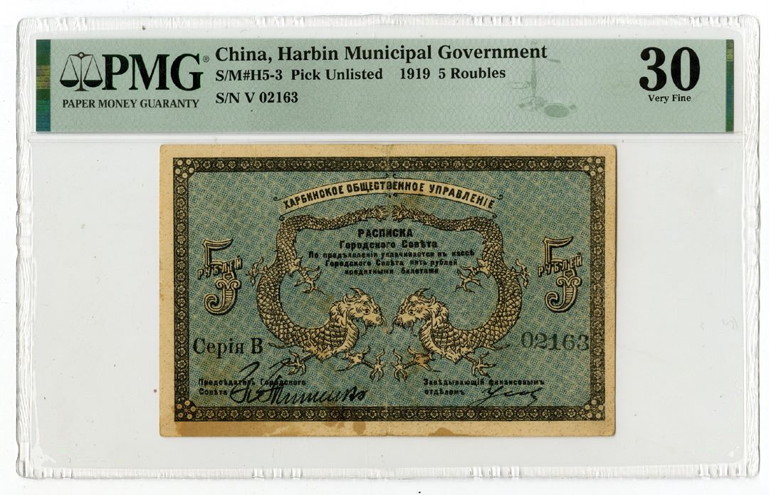 Harbin, China, 1919. 5 Rubles, P-Unlisted, S/M#H5-3, Issued banknote, Black on blue underprint with Facing dragons, Printed entirely in Russian. S/N V 02163, PMG graded Very Fine 30. High grade for the issue.