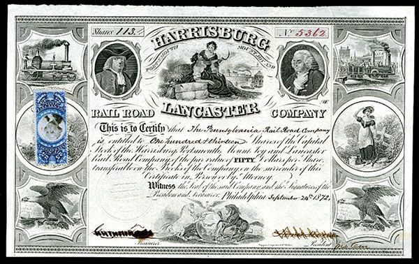 Pennsylvania. 1872. 113 Shares I/U Stock. #5362. Vignettes of Ben Franklin and William Penn center flanked by vignettes of early locomotives at top and Eagles on bottom right and left State Seal bottom center. VF condition. Toppan, Carpenter & Co. Railroad and stock listed in Cox.