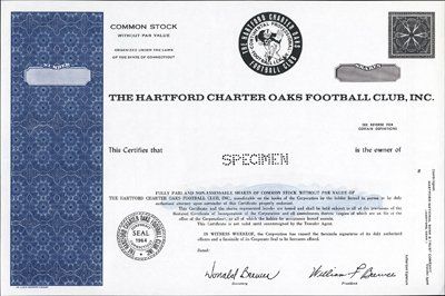 1964. Odd Shares. Specimen stock certificate. Pin punch "Specimen". Blue border with circular vignette with running football player. Choice uncirculated. De La Rue BNC.