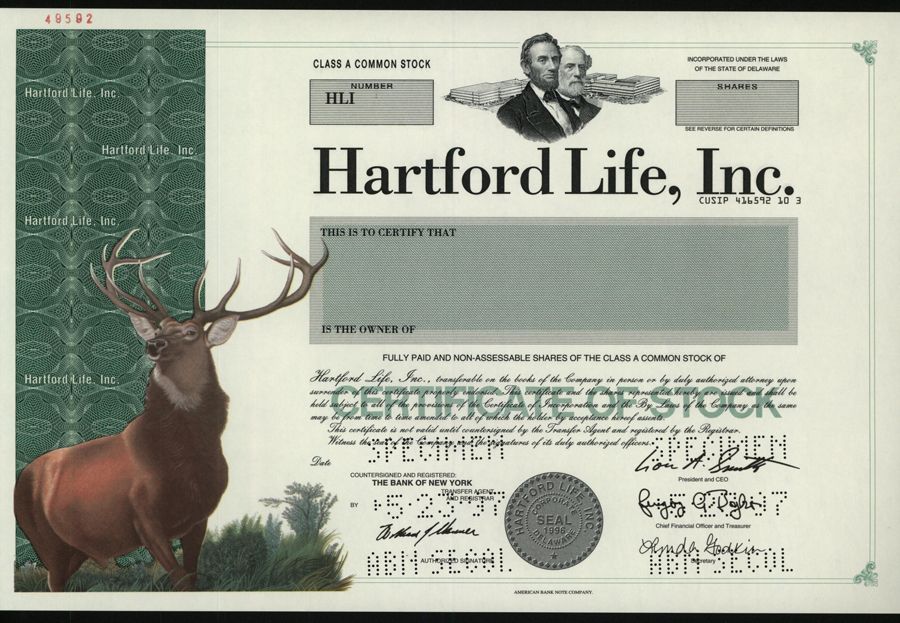 Delaware, 1997, Pin-punch Specimen Stock, Odd Shares, Black on green border and underprint, Vignette on left of a buck in full color and top center the Hartford Life offices and Lincoln and gentleman in front, VF-XF condition, ABNC.