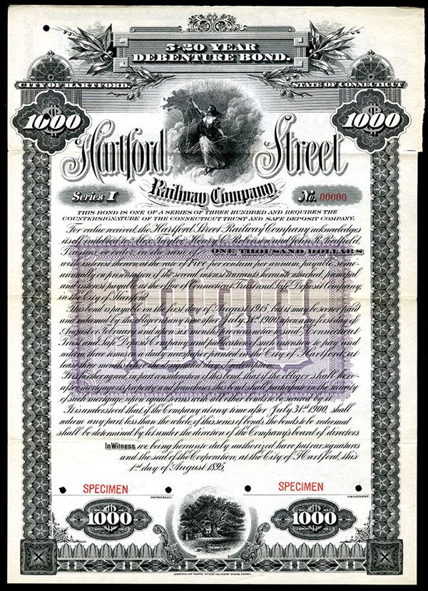 Connecticut. 1895. $1000 5% Specimen Bond. Black print with violet border and underprint. Allegorical woman top center with North America behind her and lightning bolt in her hand. POC's and red SPECIMEN overprints. VF condition with minor splitting and 40 detached coupons in booklet. ABNC.