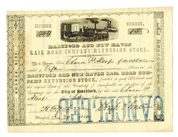 Connecticut. 15 Shares, I/U, Common Stock Certificate, Black print on black border on small sized certificate, Locomotive at top by a dock with steamboat approaching, S/N 404, Blue cancelled handstamp at bottom right, VF condition, R.C. Root & Anthony. Scarce.