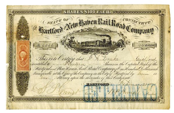 Connecticut. 14 Shares Capital Stock Issued Certificate, Black print on black border and under tint, Locomotive at center in ornate frame, Revenue stamp at left border, Cancelled stamp at bottom left corner, Fine condition with staining over left side and damage to margin condition, R.C. Root & Anthony.
