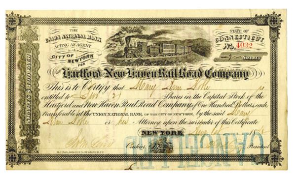 Connecticut. 2 Shares Capital Stock Issued Certificate, Black print on black border on small sized certificate, Locomotive at top, Cancelled stamp at bottom right corner, Fine-VF condition, R.C. Root & Anthony.