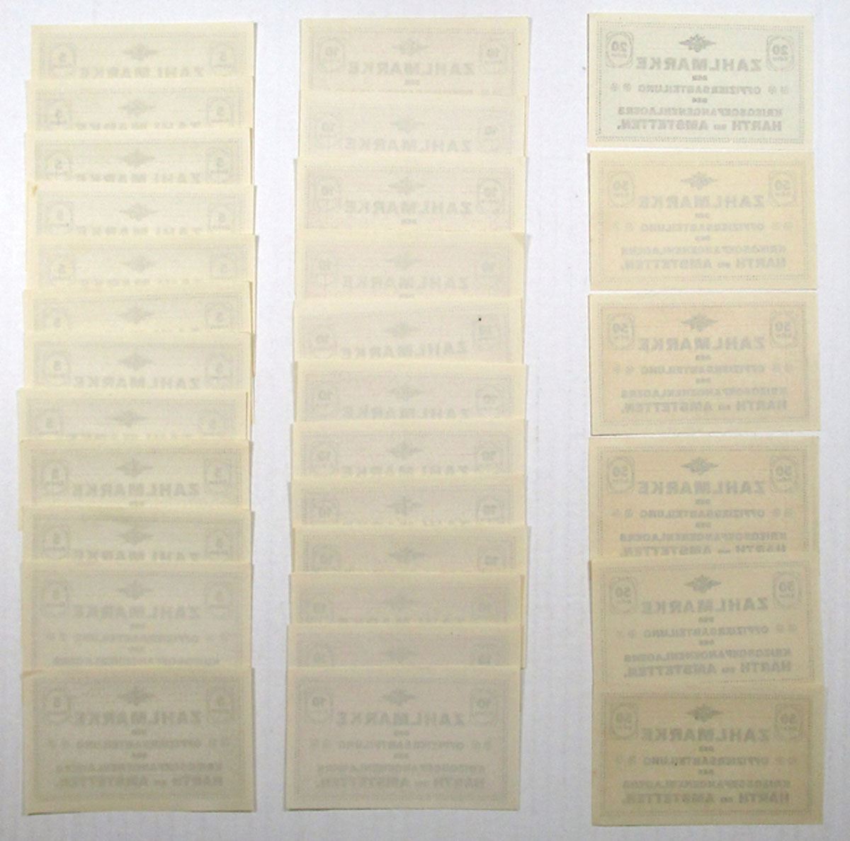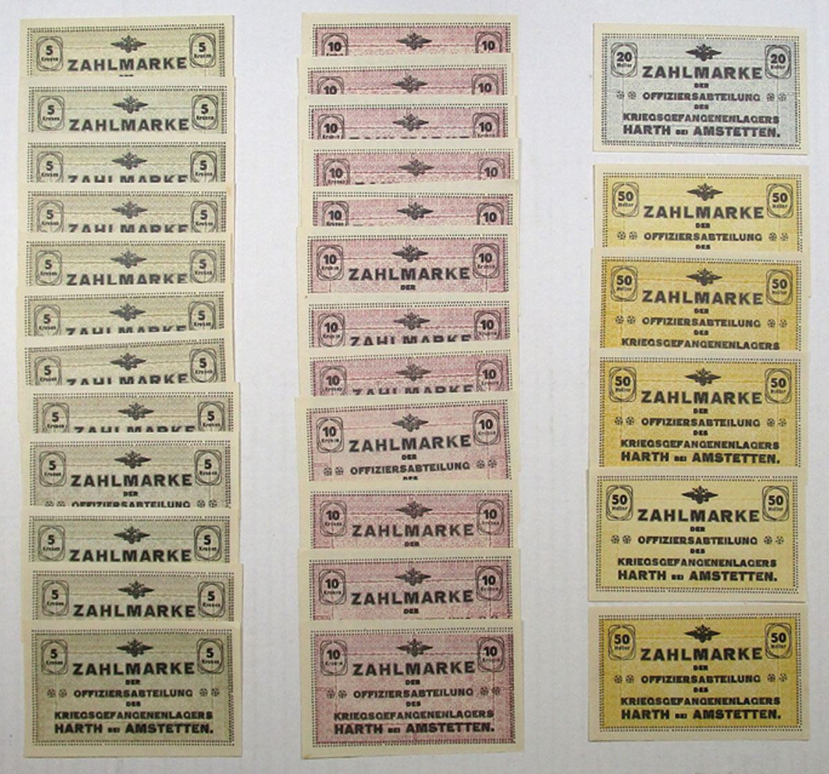 Austria, ND (1914-1918). 5 Mark (30 examples) Group of Issued Notgeld, Black on gray underprint with arms at top, Unc. to CU Condition. HART bei AMSTETTEN was a POW concentration camp in Austria, administered by the Austro-Hungarian Empire. This camp was initially setup for captured officers during the Great War. The field of Hart was a collection of shacks on a rectangular plan divided into small rooms and mostly held Russian prisoners of war. There were 280 small rooms for officer prisoners. While the units had central heating, it rarely worked due to the scarcity of fuel. (30). Sold "AS IS" no returns accepted.