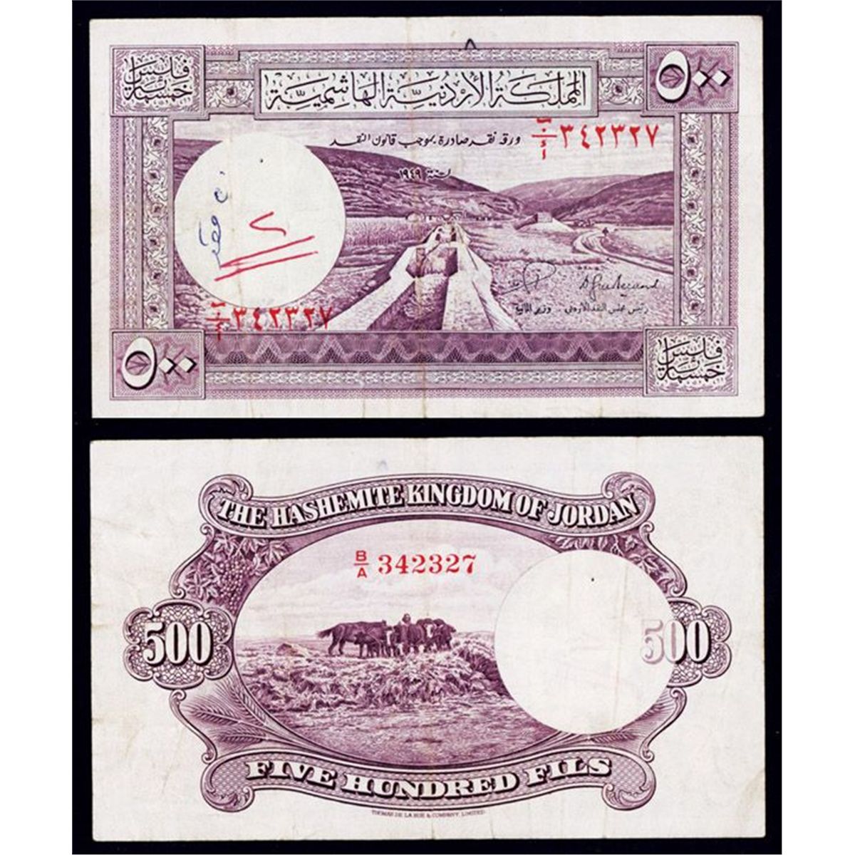 Jordan, L.1949, (1952), 500 Fils, P-5Aa, Signature 3, Lilac with landscape, Choice VF with firm paper, sharp corner, bright colors with only 2 graffiti marks on the front left of the note, otherwise an attractive example of this scarce note. TDLR.