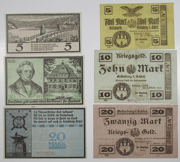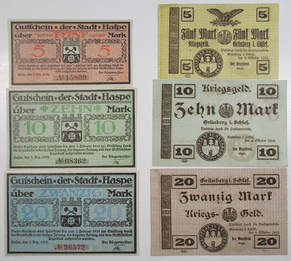 Germany. 1918, Lot includes from Haspe a trio of 5, 10, and 20 Mark Notgeld; and from GrŸnberg in Schlesien (Zielona Gora, Poland today) a trio of 5, 10, and 20 war Notgeld. VF to XF. (6)