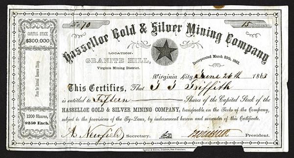 Granite Hill, Virginia Mining District, N.T., June 26th, 1863, 15 Shares, I/U. Black without underprint, Star in middle under curved title, No U.S.I.R. revenue stamp, Issued to J.F. Griffith. S/N 70, Fine condition with stain on top right excess margin and missing a 2 inch portion of the lower right border that was neatly cut. Rare Nevada Territory Mining stock certificate from a new estate find. Towne & Bacon, Printers, San Francisco.