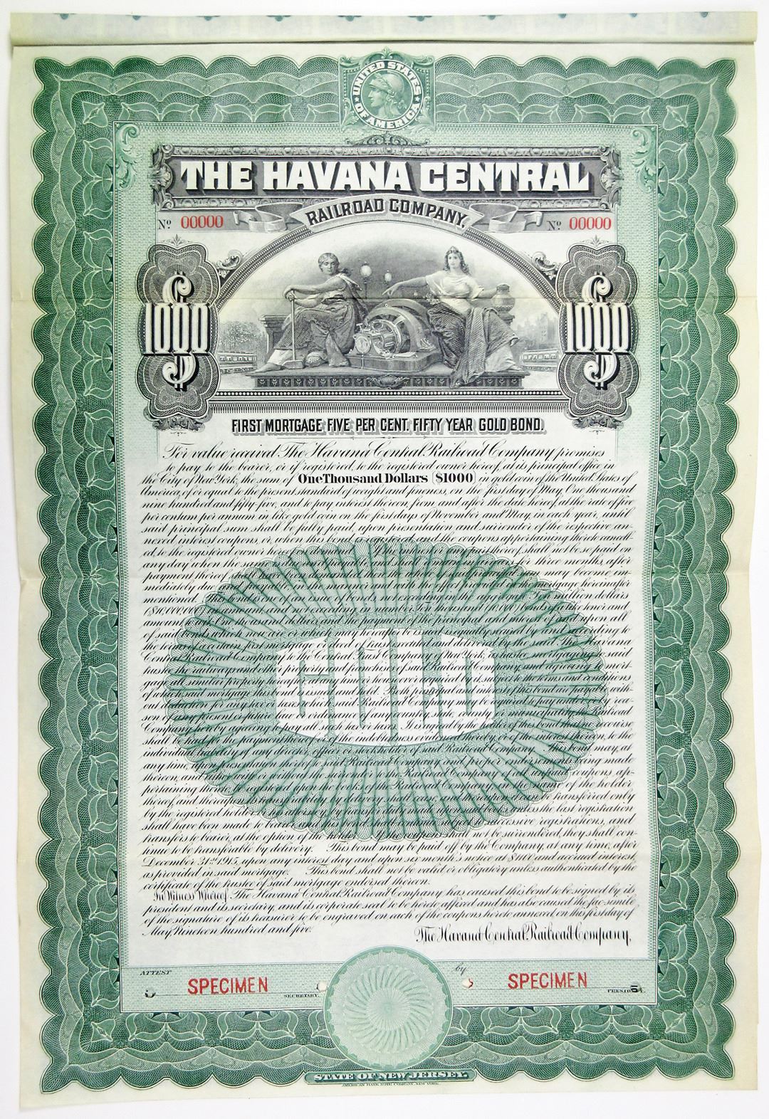 Havana, Cuba (Inc. in New Jersey), 1905. $1000 Specimen 5% First Mortgage Gold Coupon Bond, Black text with green border and undertint, Allegorical women seated next to railroad gear at top. Red specimen overprints, "00000" serial numbers, POCs. VF condition, ABNC. Unlisted as a bond in Cox, Very Rare.
