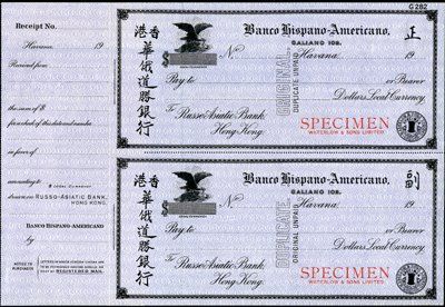 19--, ca.1910-20's. Specimen "Original" and Duplicate" drafts or checks. Coresponding bank is the "Russo Asiatic Bank, Hong Kong". Black border and vignette printed on light grey undertint. Eagle feeding chick vignette. Counterfoil attached. Chinese characters on left and right of draft. Red "Specimen - Waterlow & Sons Limited" overprint on each check with black embossed "Specimen" overprint of Waterlow & Sons on lower right corners. XF condition. Waterlow & Sons, Ltd.