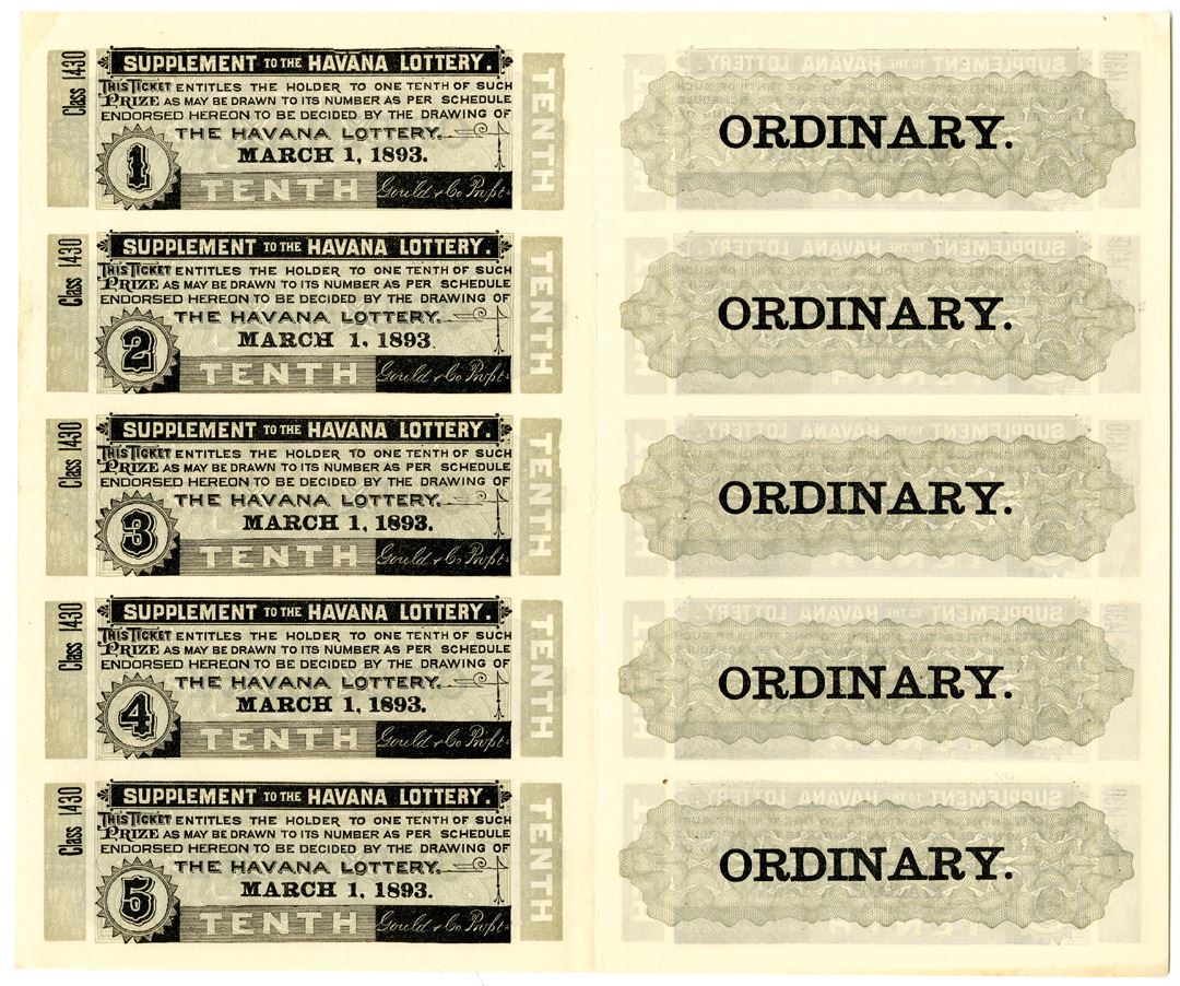Havana, Cuba, 1893. Uncut sheet of 10 Ordinary Supplement Tickets to the Havana Lottery, Black text with gray-green background. AU to Uncirculated condition. The Havana Lottery was founded in 1812 by a Government decree, which at the same time prohibited private lotteries and all other forms of gambling in Cuba.