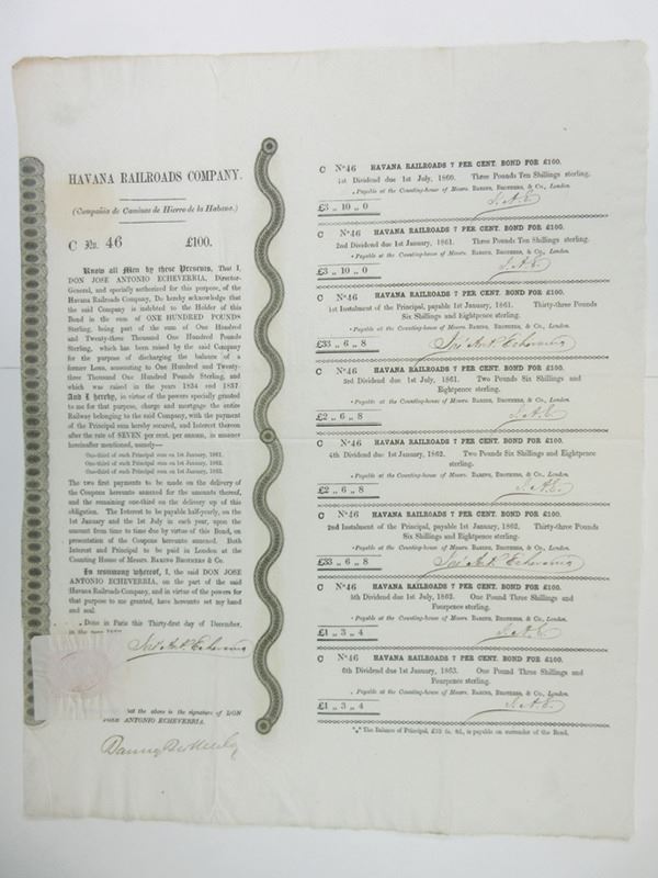 Paris and Cuba. 1850, I/U, Havana Railroads Company, 7 Per Cent Loan, 1850, Paris emission, £100 bond, No. 46, counterfoil, left, snake-like border and coupons, right. Issued to and signed by Don Jose Antonio Echeverria, EF. Scarce. (John E. Herzog Collection)