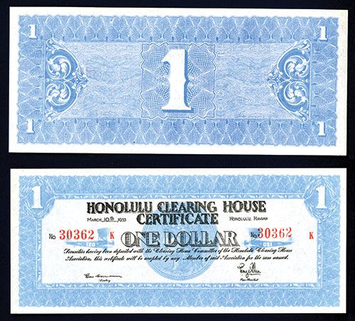Honolulu, Hawaii. March 10th, 1933. $1. P-Unlisted. Issued and uncancelled banknote. Black on light blue. Biplanes on left and right flank liberty in middle, back blue. S/N 30362 K. Uncirculated to CU condition. Scarce note from a popular location.