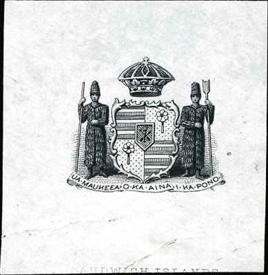 1860-70's. Early "Arms of Hawaii" proof by NBNC. Cut down large die proof. Written on bottom "Sandwich Islands". Choice Unc. Rare early Hawaiian item. NBNC.