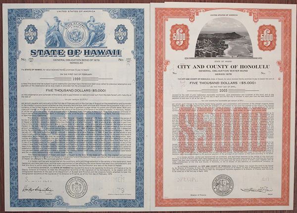 Hawaii. Lot includes 2 pieces: Includes City and County of Honolulu, 1978 $5000 Specimen 4.75% General Obligation Water Coupon Bond in brown; State of Hawaii, 1979 $5000 Specimen 6% General Obligation Coupon Bond in blue. Both are in XF condition, and printed by SCBN. 2 pieces.