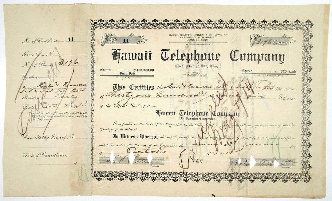 Hilo, Territory of Hawaii, Hawaiian Islands (Printed on an 1880 Kingdom of Hawaii Stock certificate for), 1913. 3,176 Shares I/C Capital Stock Certificate, S/N 11, Black text with black border. Cancelled POCs and in ink. Fine to VF condition. Counterfoil on left.