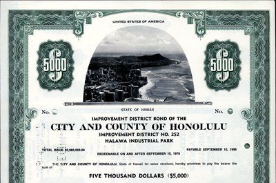 1977. $5,000. 2 different specimen bonds. Green or orange border.. Pin punched specimen overprints. Photo vignette of birds-eye-view of Honolulu coastline, hotels and beaches. Rare. SCBNC.