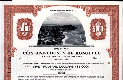 ca.1970's. $5,000. 2 different specimen bonds. 10. City and County of Honolulu Bond. Brown border. Photo vignette of birds-eye-view of Honolulu coastline, hotels and beaches; 2). State of Hawaii General Obligation Bond of 1979. Blue border. Allegorical figures flank Hawaii Arms. Pin punched specimen overprints. XF condition. Rare. SCBNC.
