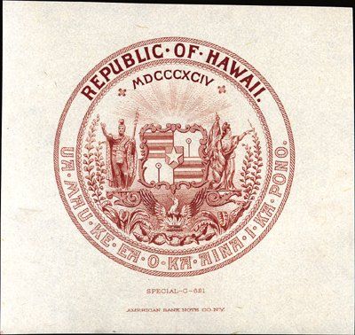 ca.1894. Proof vignette in brown printed on india paper. King on left with allegorical woman on right with "Republic of Hawaii" on top and Hawaiian language on bottom. Circular 2 inches in diameter. In English and Hawaiian. Imprint of ABNC. I think that this was used on the back of the 1895 (1897) Silver Certificate of Deposit Issue - Series C, P-11 to P-15. Choice uncirculated condition. Rare. ABNC.