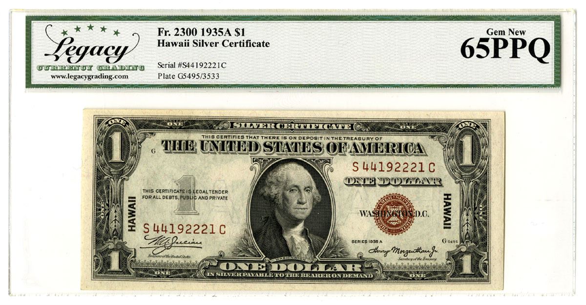 Hawaii - WWII Emergency Issue, $1, Series of 1935A, P-36a, Fr.2300, Issued Banknote, Black printing with George Washington at center and brown seal at right, Back is green with Great Seal flanking One at center with 'Hawaii' overprint, Julian | Morgenthau Signatures, S/N S44192221C Plate G5495/3533, Legacy graded Gem New 65PPQ.