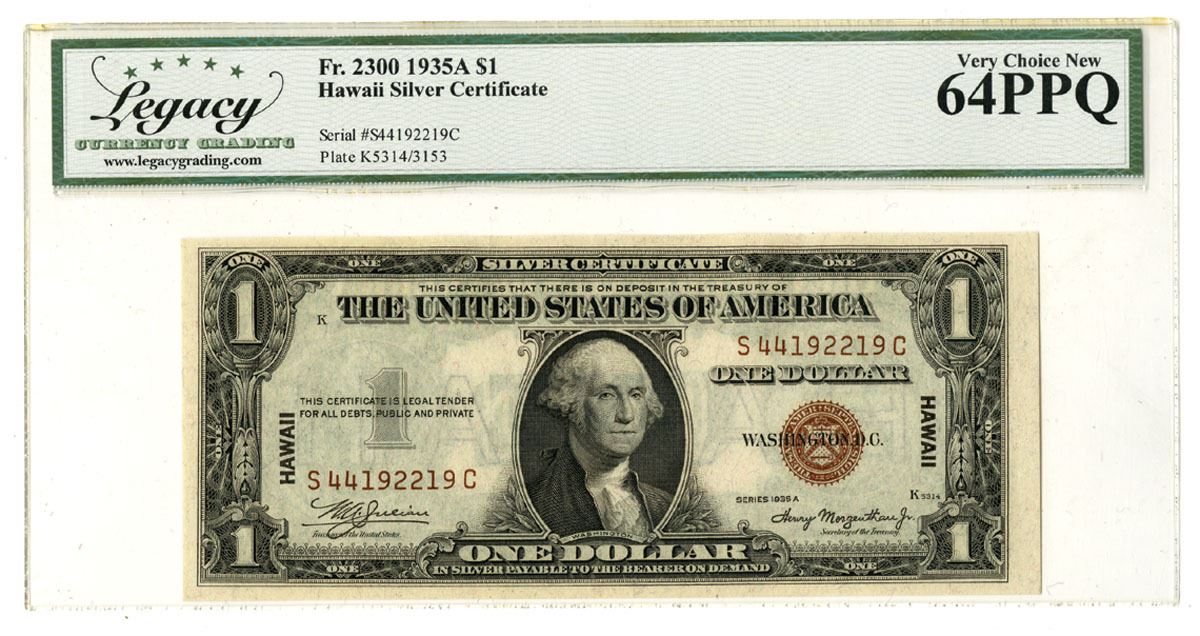 Hawaii - WWII Emergency Issue, $1, Series of 1935A, P-36a, Fr.# 2300, Issued Banknote, Black printing with George Washington at center and brown seal at right, Back is green with Great Seal flanking One at center with 'Hawaii' overprint, Julian | Morgenthau Signatures, S/N S44192219C pp K5314/3153, Legacy graded Very Choice New 64 PPQ.