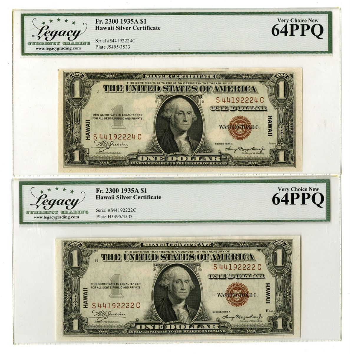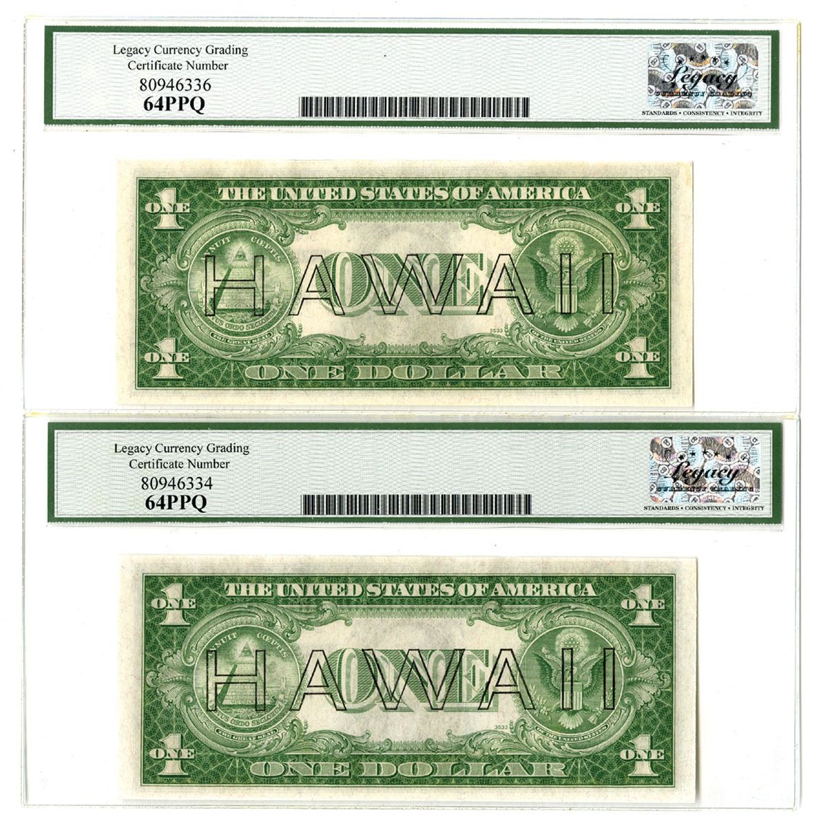 Hawaii - WWII Emergency Issue, 1935. $1, P-36a (2), Series of 1935A, Fr.# 2300, Issued Banknote Pair, Both have Julian | Morgenthau signatures, Brown seals at right, 'Hawaii' overprint on back, S/Ns S44192222C pp H5495/3533 & S44192224C pp J5495/3533, Both are Legacy graded Very Choice New 64 PPQ. (2).