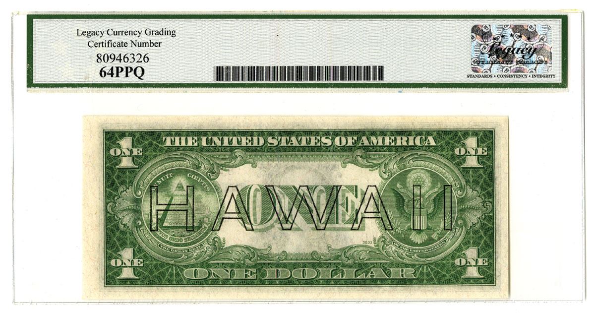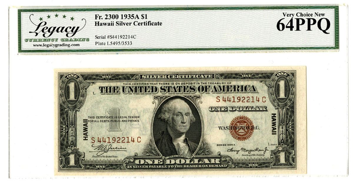 Hawaii - WWII Emergency Issue, $1, P-36a, Series of 1935A, Fr.# 2300, Issued Banknote, Julian | Morgenthau signatures, Brown seal at right, 'Hawaii' overprint on back, S/N S44192214C pp L5495/3533, Legacy graded Very Choice New 64PPQ.