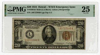 Hawaii - WWII Emergency Issue, $20 Fr# 2304m 1934, Julian | Morgenthau Signatures, S/N L60722640A, PMG graded Very Fine 25