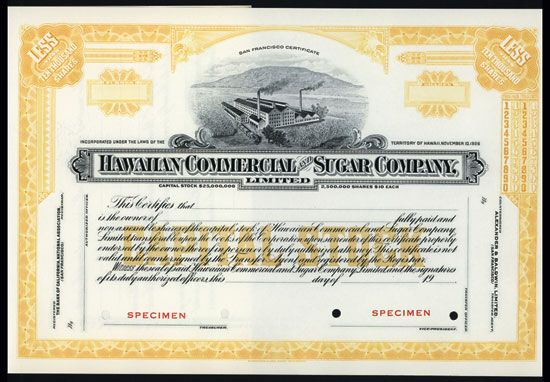 Hawaii, 19xx, <1000 Shares, Specimen Stock, Black on yellow border and underprint, Sugar plantation with locomotive leaving factory top center, Red SPECIMEN overprints and POC's, VF-XF condition, HBNC.