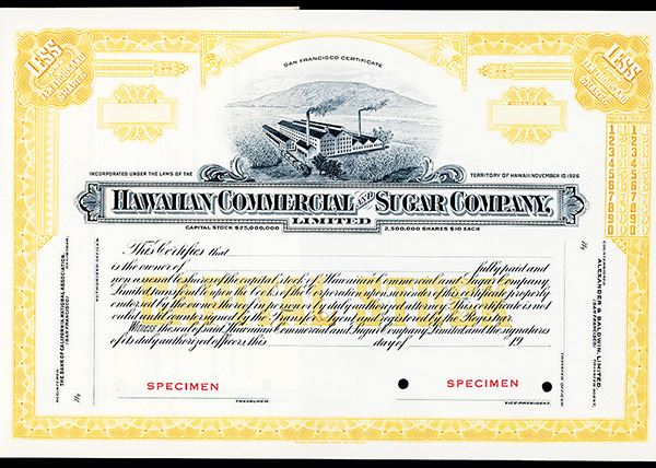 Hawaii, 19xx, <1000 Shares, Specimen Stock, Black on yellow border and underprint, Sugar plantation with locomotive leaving factory top center, Red SPECIMEN overprints and POC's, VF-XF condition, HBNC.