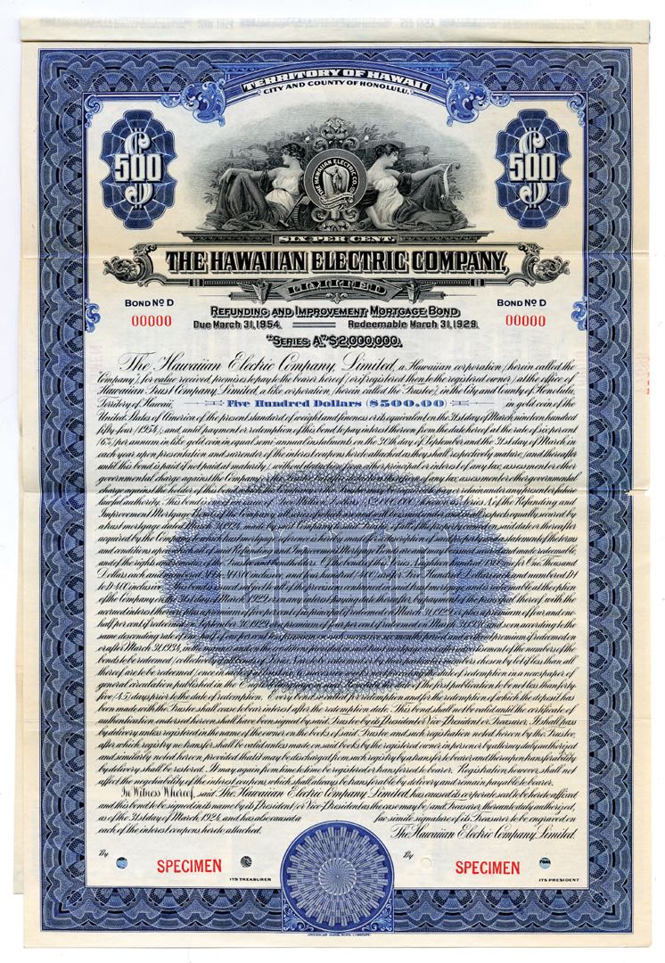 Territory of Hawaii, 1924. $500 Specimen 6% Series A Refunding and Improvement Mortgage Coupon Bond, Black on blue border and underprint, Allegorical females at top flank company logo, Specimen overprints and POC's, XF-AU condition with minor splitting at fold lines, ABNC. Hawaiian Electric Company (often abbreviated HECO, pronounced HEE-coh) incorporated on October 13, 1891. Within about 16 years the utility had 2,500 customers on Oahu. By 1914 HECO had started rural service to the windward side of the island and was marketing electric products like refrigerators and flat irons. In 1937 HECO broke ground on its second power plant, and transmission lines soon crisscrossed Oahu.