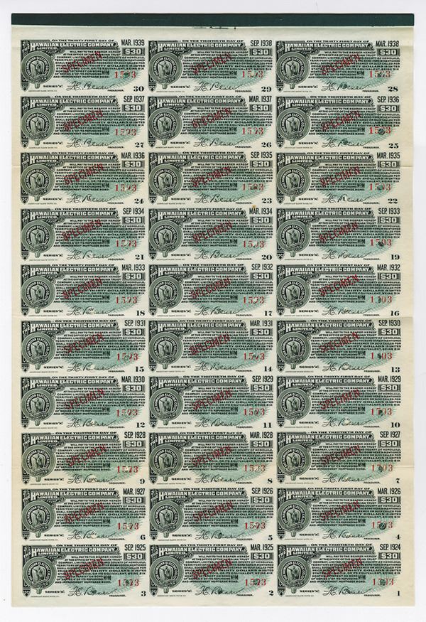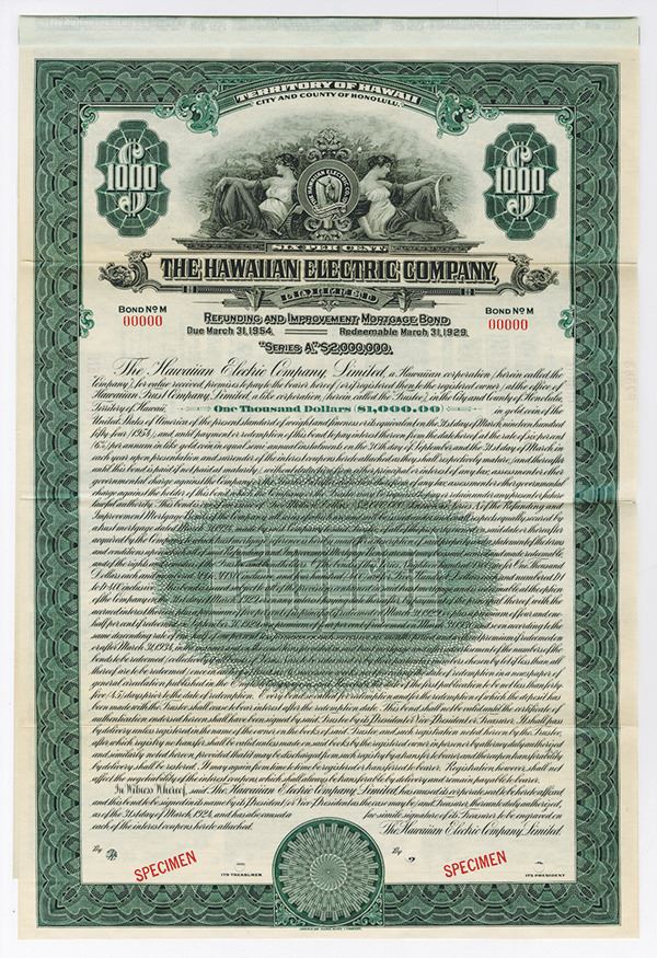 Hawaii, 1924, $1000, 6 % Refunding and Improvement Mortgage Specimen Bond, Coupons attached, Black on blue border and underprint, Vignette of two reclined allegorical women flanking the company's logo, Red SPECIMEN overprints POC's and red s/n "00000", VF-XF condition, ABNC. Rare bond with only 3 or 4 known.